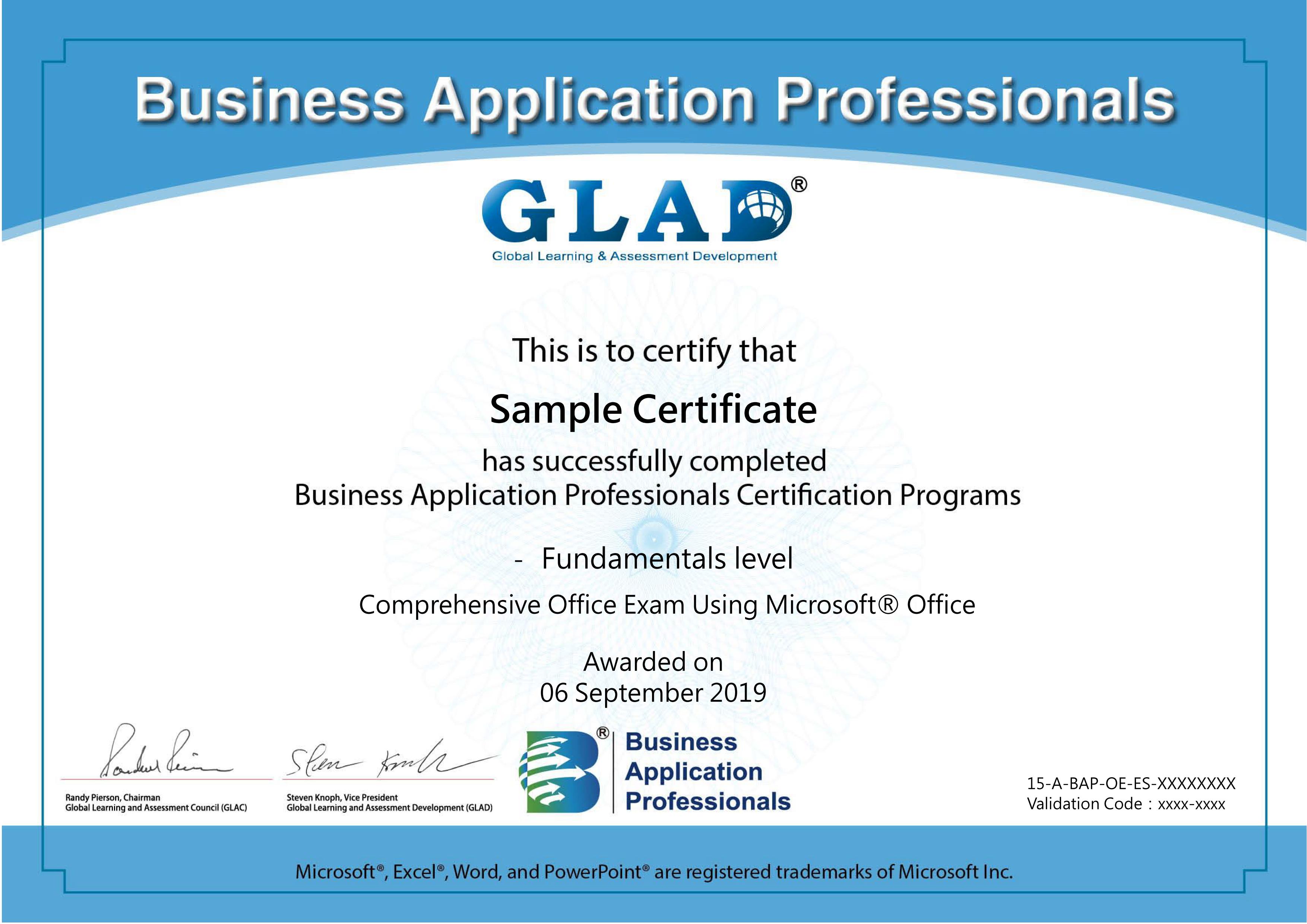 BAP 商务专业应用能力国际认证是第一张强调学习概念的 Office 国际认证。BAP 认证是邀集了产业界、学术界的 Office 专家共同参与指导研发的 Office 考核能力认证,是升学推甄者、求职者、在职者及自我能力价值肯定的重要依据之一。 认证的范围包含 Documents 文书处理、Spreadsheets 电子试算表格、Presentations 商业简报,并依据难易程度区分为三个能力级别:Fundamentals 基础能力、Essentials 核心能力、Professional 专业应用能力。