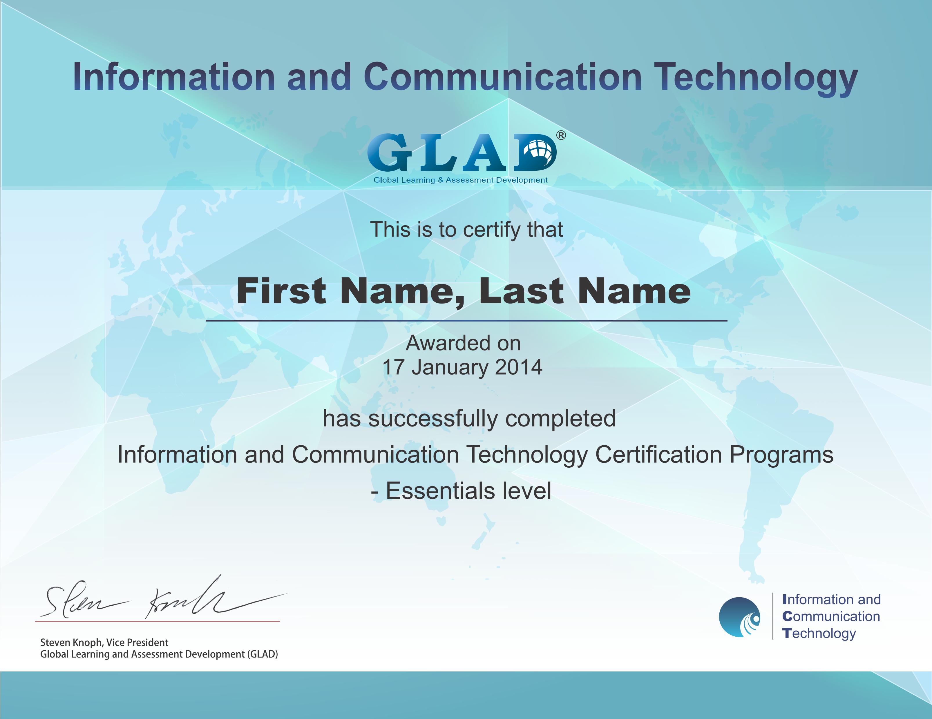 ICT 计算机综合能力国际认证的发证单位为 GLAD 全球学习与测评发展中心,为 CompTIA 成员之一,也是全球测评发行行业协会 ATP 的成员之一。总公司位于美国有第二个硅谷之称的加州 Irvine (尔湾市)。公司离美国著名加州大学尔湾校区 UCI 不远,并分别在加拿大多伦多等地逐一建立研发基地。