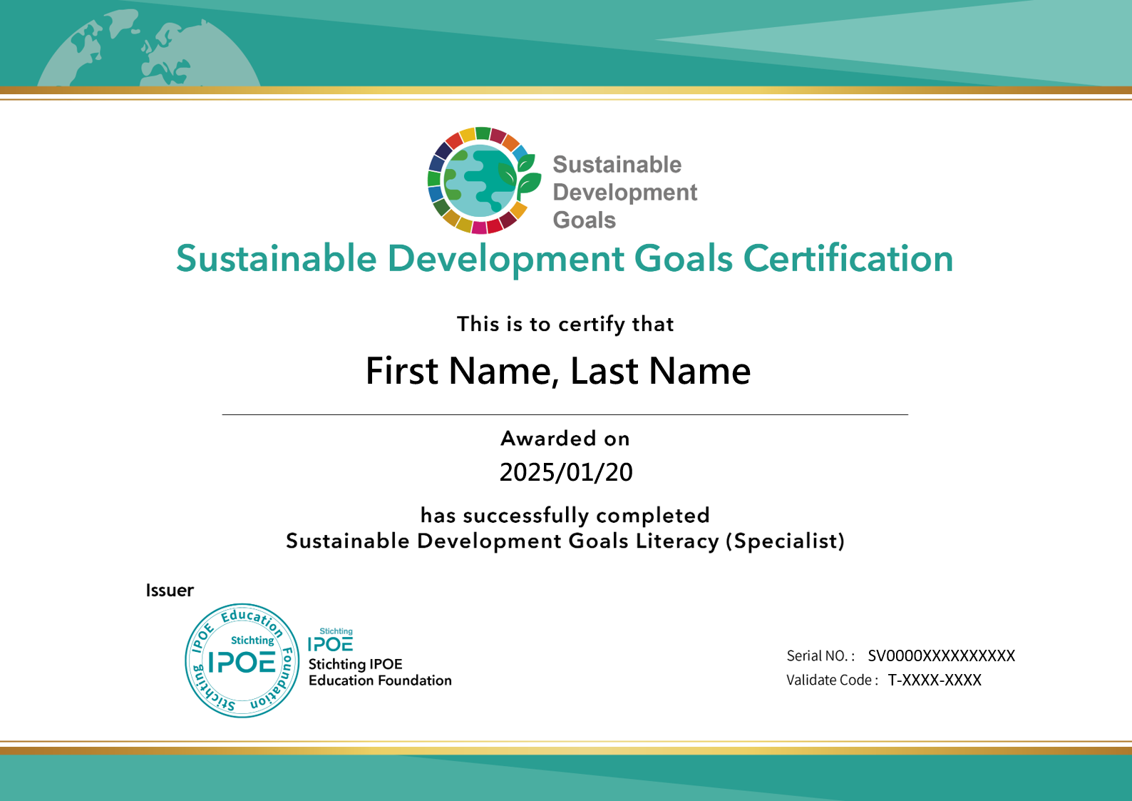 SDGs可持续发展目标国际认证的发证单位为荷兰艾葆科教基金会(Stichting IPOE Education Foundation)。
